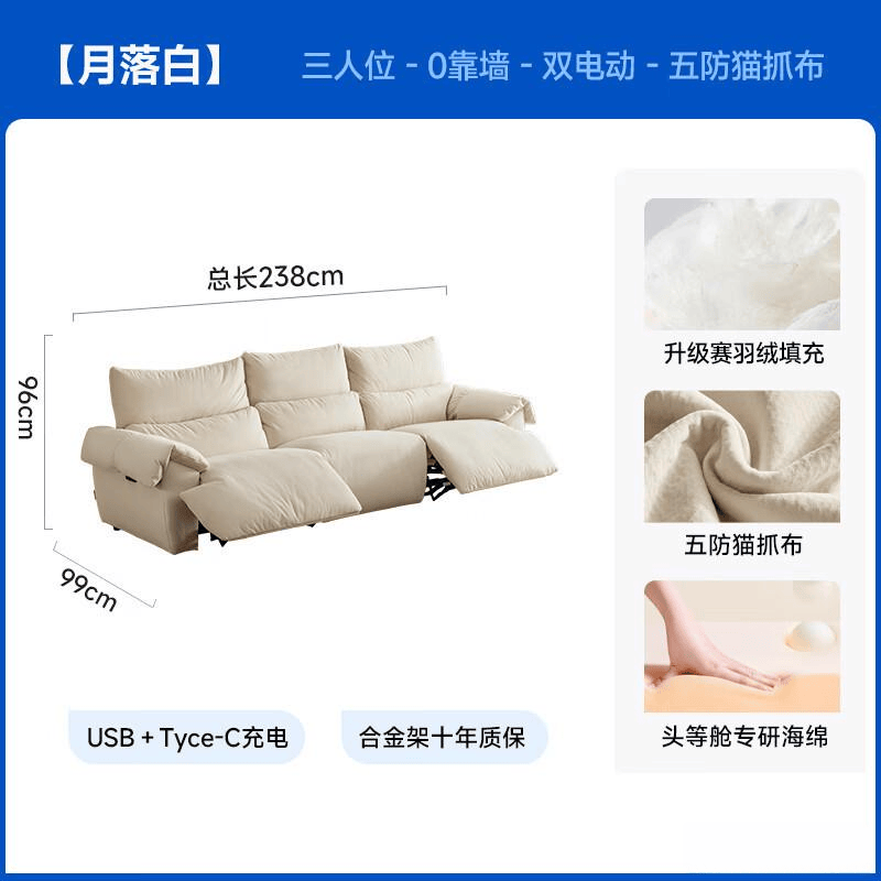 在功能设计上,这款沙发配备了双电动调节系统,操作流畅静音,只需轻按按钮,就能自由调节靠背和脚托的角度。更贴心的是,它支持0靠墙使用,无需预留后方空间,小户型也能轻松摆放。搭配的USB和Type-C双充电接口,让你在沙发上休息时也能随时为手机补电,再也用不着担心设备没电的尴尬。这一些细节设计,体现了品牌对现代人生活方式的深入洞察,把便利真正融入到了日常点滴之中。