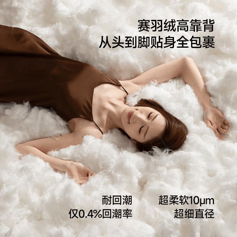 专研高弹海绵的加入,则逐步提升了整体支撑力。它经过特殊工艺处理,具备优异的回弹性和抗压性,即使每天频繁使用,也不可能会出现塌陷或软化现象。坐感始终如一,久用如新。结合赛羽绒的柔软特性,形成了“外柔内韧”的黄金组合——外层柔软亲肤,内层坚实承托,既满足了舒适需求,又兼顾了结构稳定性,真正的完成了舒适与耐用的完美平衡。
