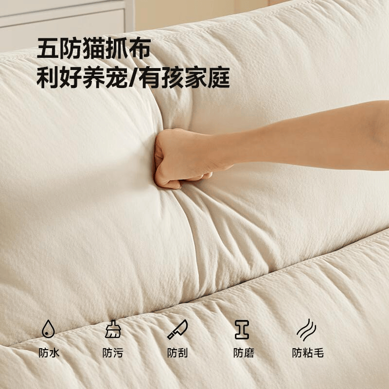 针对现代家庭的实际痛点,这款沙发特别采用了五防猫抓布面料。它具备防水、防污、防刮、耐磨、防粘毛五大特性,很适合有宠物或孩子的家庭。洒落的饮料轻轻一擦就干净;猫咪抓挠?表面坚韧不易破损;毛发粘附?一刷即落,清洁毫不费力。这种面料不仅实用性强,视觉上也保持简洁高级,米白色温润优雅,橙棕色温暖治愈,无论哪种配色,都能自然融入家居环境,提升整体格调。