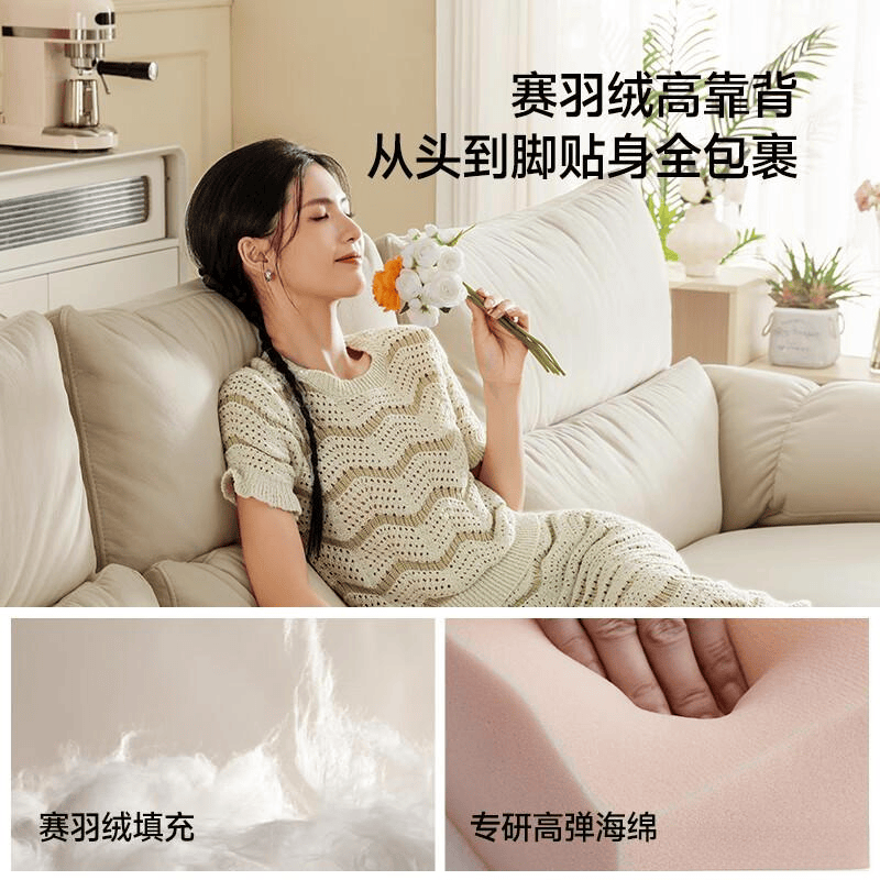 沙发采用的赛羽绒填充是其舒适核心之一。这种材质纤维细至10微米,触感超柔软,带来轻盈蓬松的包裹感,仿若置身云端。与传统填充物相比,它的耐回潮性能极为出色,回潮率仅为0.4%,即便在潮湿环境中也能保持干爽柔软。经常使用不易板结、不变形,从始至终维持初见时的饱满状态。这种高级别的材质应用,让沙发不单单是家具,更像是一个可以长久陪伴你的舒适港湾。
