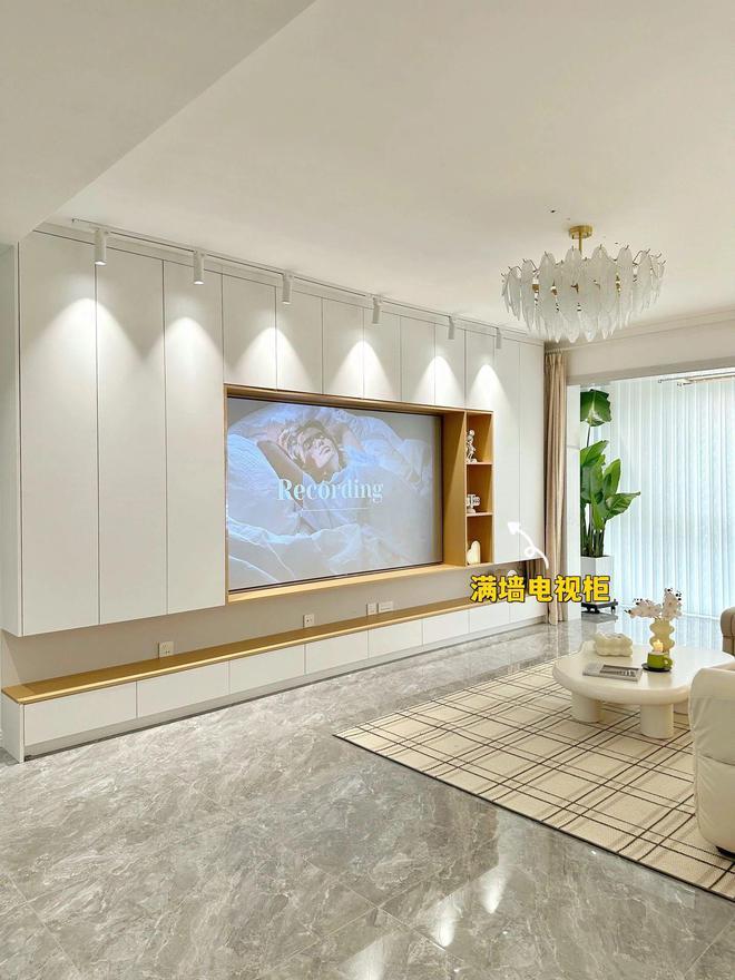 满墙电视柜和传统的小电视柜相比,空间利用率更高,能把整面墙的空间都用上。