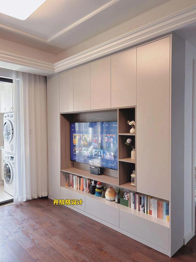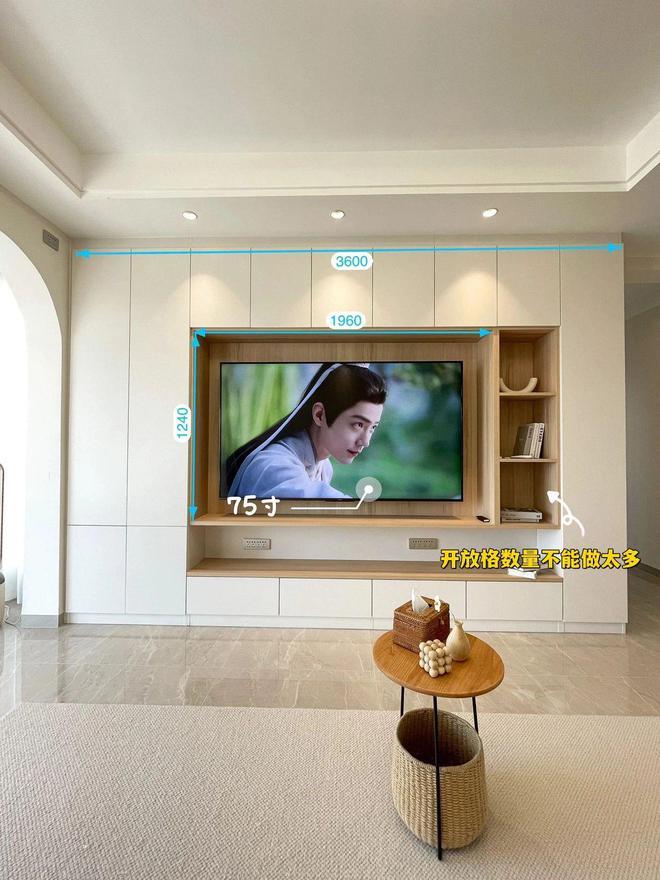 开放格的位置可以设计在电视机的左右两侧,不要做太高或太矮,最好是人站着时手能触碰到的高度,这样不仅拿东西方便,而且平时擦灰也会比较轻松。