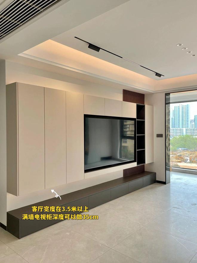 一般来说,想要做满墙电视柜,电视墙和沙发墙之间的宽度至少要在3.5米以上,这样布置完沙发、茶几、电视柜以后,还能留出一半以上的活动空间,感觉是比较宽松的。