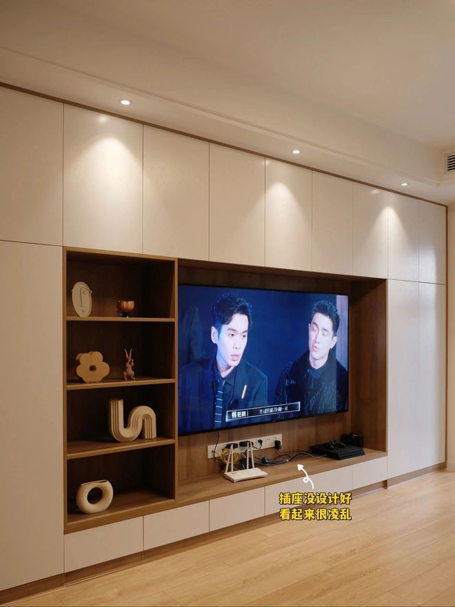 有些朋友家里做满墙电视柜,本来柜子的外观是很高级的,但是插座没有设计好,把电视机、路由器、机顶盒一插上,就看着乱糟糟的。