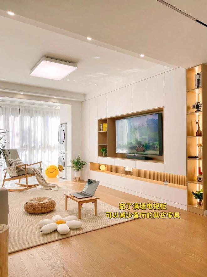 很多朋友想做满墙电视柜,但又担心客厅面积小,做整面大柜子会有压抑感,便放弃了。